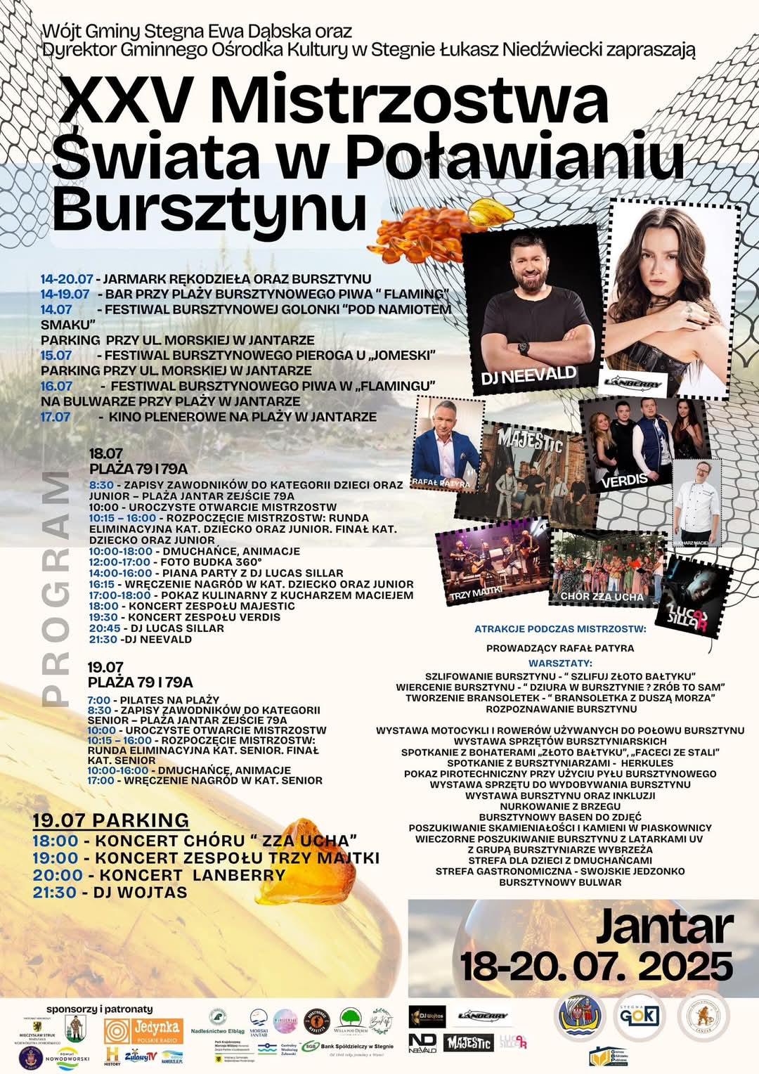 Zapraszamy na wyjątkowe wydarzenie, które łączy tradycję, radość i nadmorski klimat – jubileuszowe XXV Mistrzostwa Świata w Poławianiu Bursztynu w Jantarze. To trzy dni pełne słońca, bursztynu, zabawy i pozytywnej energii – idealna okazja, by oderwać się od codzienności i zrelaksować nad Bałtykiem.