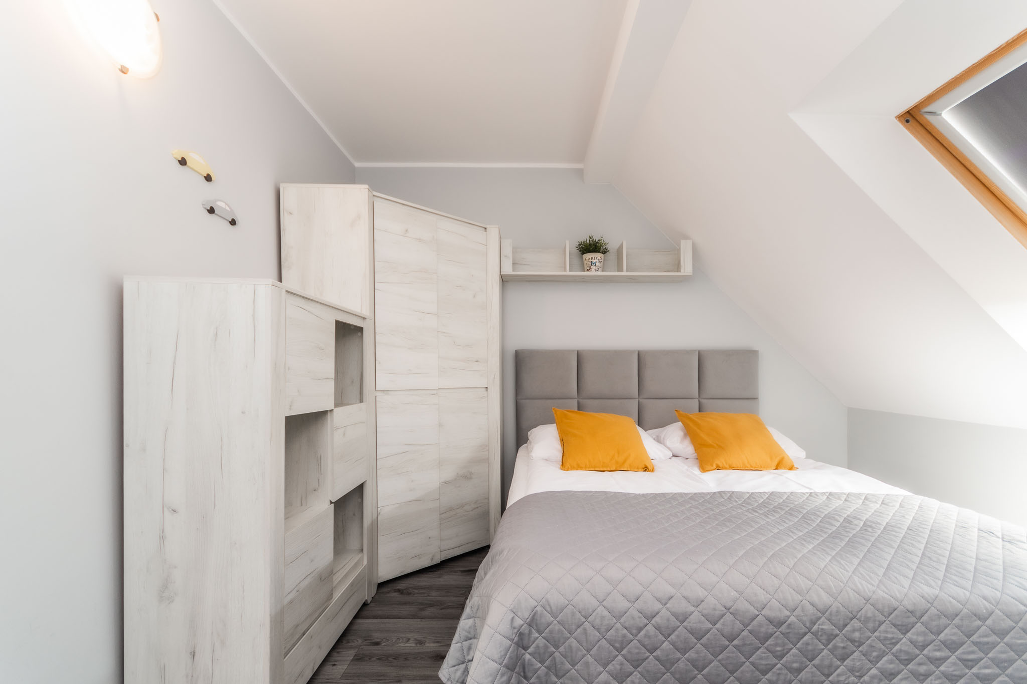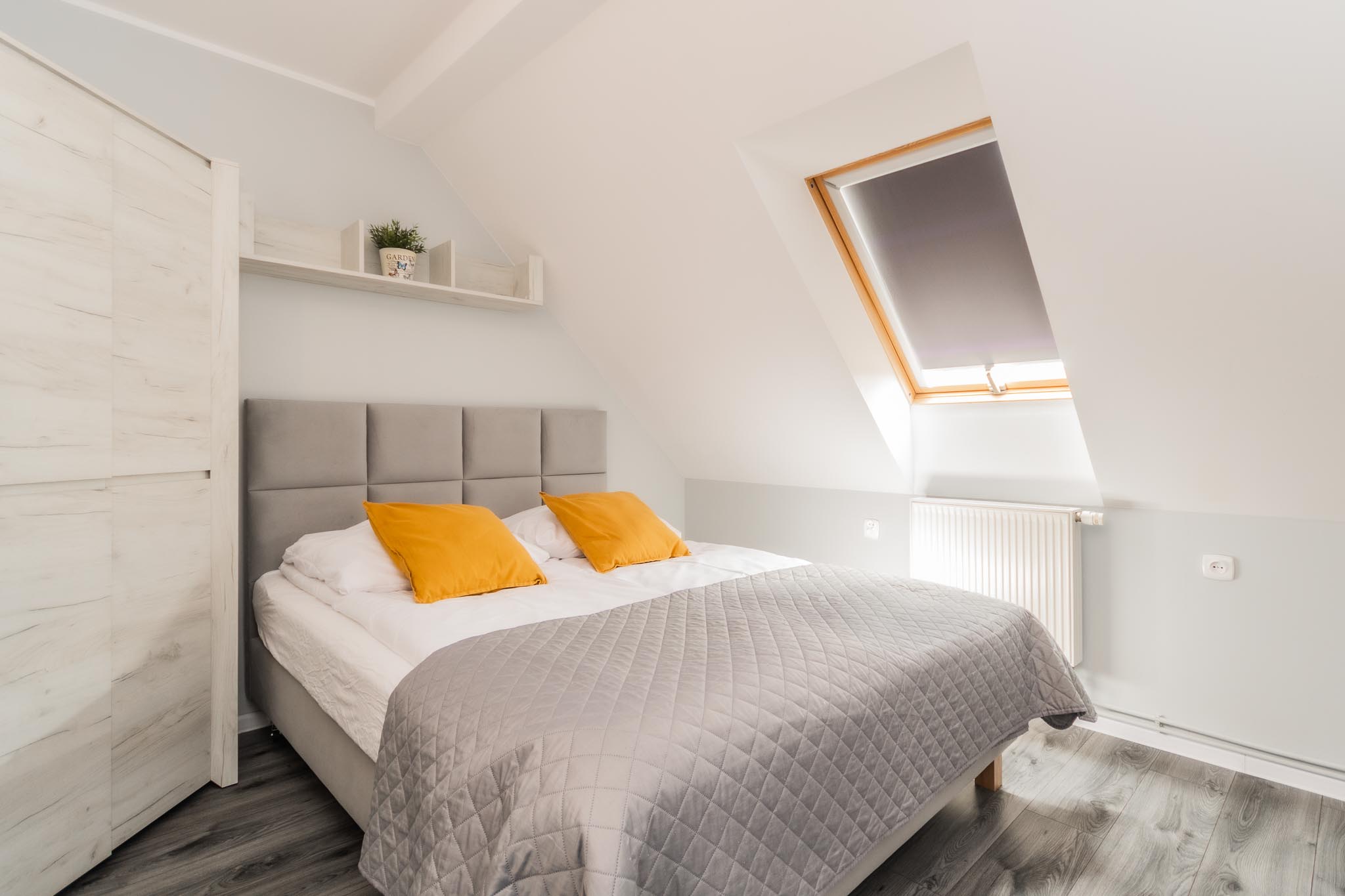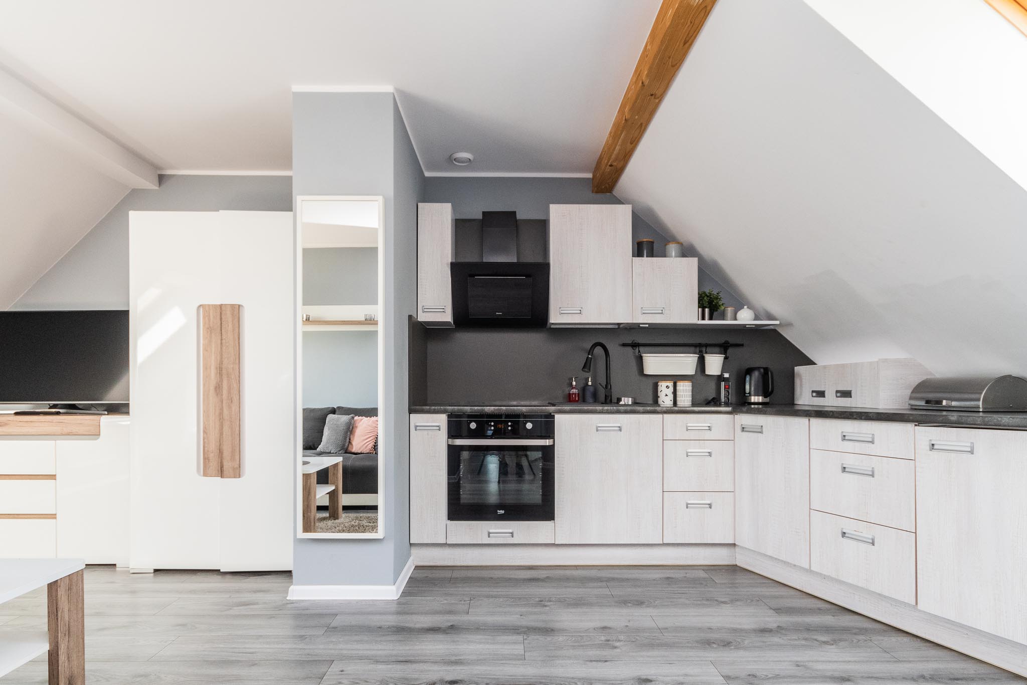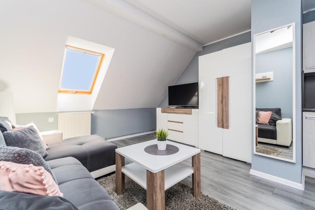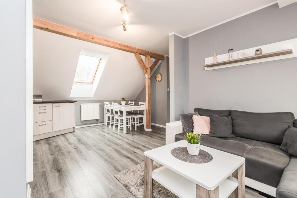 Zapraszamy do komfortowego apartamentu, w którym można w pełni odpocząć i cieszyć się spokojnym pobytem. W sypialni czeka wygodne łóżko małżeńskie, gwarantujące relaks po dniu pełnym wrażeń, a dodatkowa rozkładana kanapa zapewnia wygodne miejsce do spania.