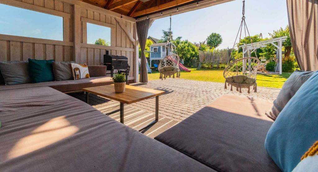 Bezpośrednie wyjście na taras i ogród pozwala cieszyć się świeżym powietrzem i pięknymi widokami o każdej porze dnia. Do dyspozycji gości jest również aneks kuchenny z lodówką, w pełni wyposażony w niezbędne sprzęty takie jak sztućce, garnki oraz szklanki, co umożliwia przygotowanie posiłków we własnym zakresie.